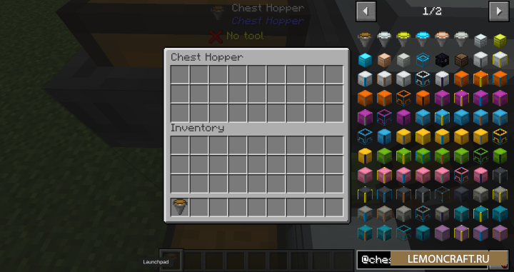 Мод на воронки с сундуками Chest Hoppers позволит автоматизировать некоторые процессы путем добавления в игру воронки с сундуками. В данных воронках будет больше места и стандартный функционал, но просто бросить туда предмет не получится. Для того, что бы положить предмет в воронку, вам нужно будет ее открыть, так же как и сундук. Данный мод совместим с модом Iron Chests.